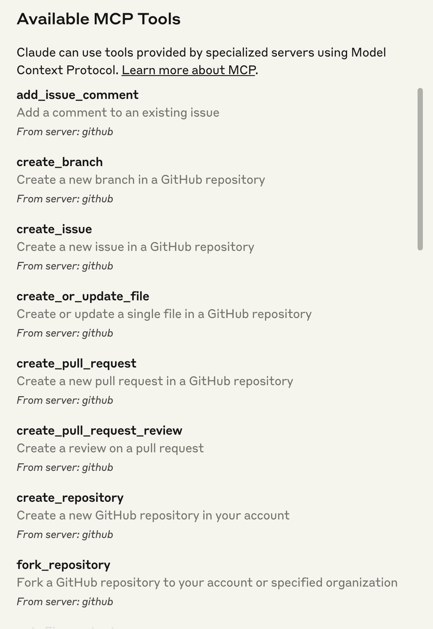 从图上可以看到,通过创建仓库test-mcp这样的提示词,Claude 的大模型自行判断需要使用 mcp 中提供的create_repository能力,从而完成了仓库的创建,接下来我们打开 Github 也确实发现了这个已经创建的仓库。